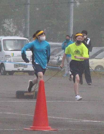 ラグビーボールをタイヤの輪の中に入れて、テニスラケットに乗せて、ドリブルで、手に持ってリレーします。